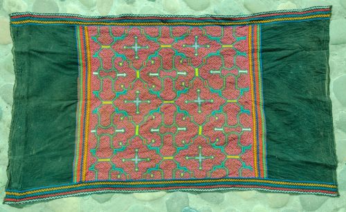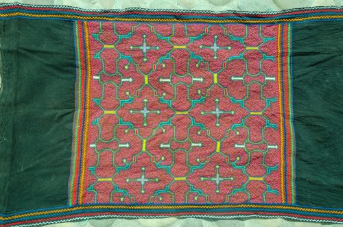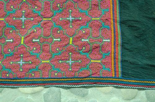 Large dark brown cotton cloth hand embroidered by the Shipibo mainly in magenta with touches of green, blue, yellow, red, pink and lavender. The geometric designs represent the Shipibo’s map on how to return to the stars. This one is super gorgeous!