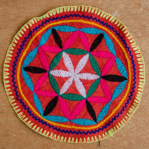 Beautiful, small round Shipibo cloth with Flower of Life pattern embroidered in bright pink, turquoise, green, purple, white and yellow on a terra cotta colored cotton background.