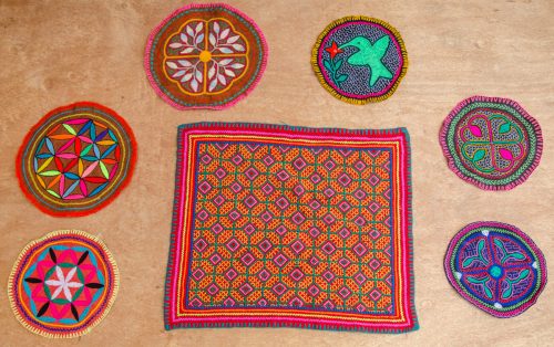 Beautiful round Shipibo cloth in a flower pattern embroidered in blues, white, pinks, orange, green and magenta.