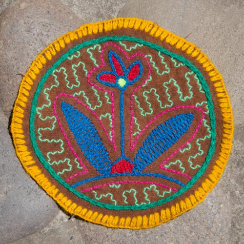Small round Shipibo embroidery in greens, magenta, blue and yellow on brown cotton.