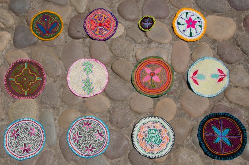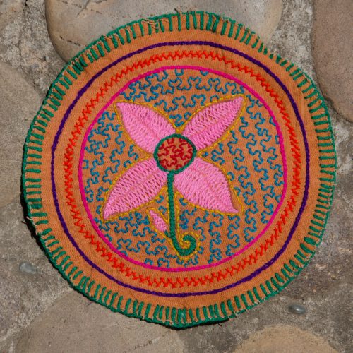 Small round Shipibo embroidery of a flower in pink, magenta green, red and yellow on light brown cotton.