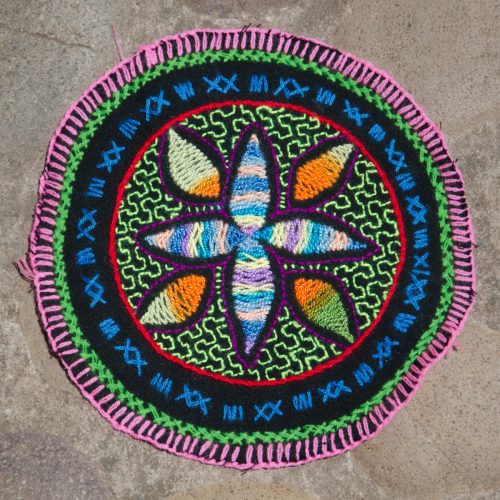 Round Shipibo embroidery of a multi-colored flower with four leaves in greens, pink, blues, yellow and orange on black cotton.