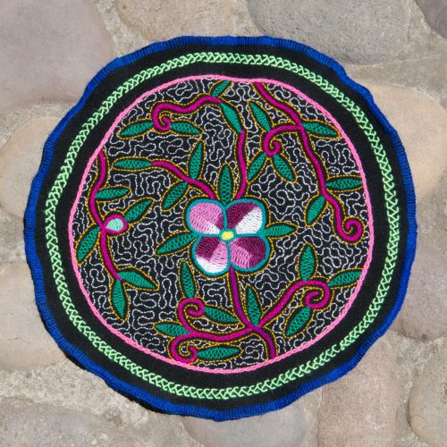 Large round Shipibo embroidery of Ayahuaska vines in greens, rose, white and blue on black cotton.