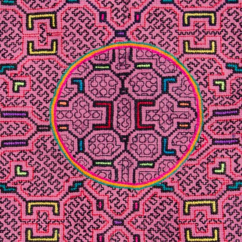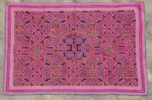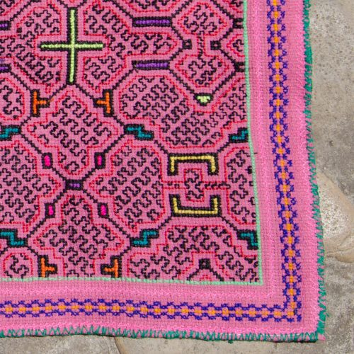 Rectangular Shipibo Embroidery of the Map to Return to the Stars in black, red, yellow, orange, purple, green, blue on pink cotton.