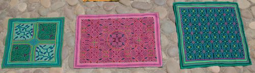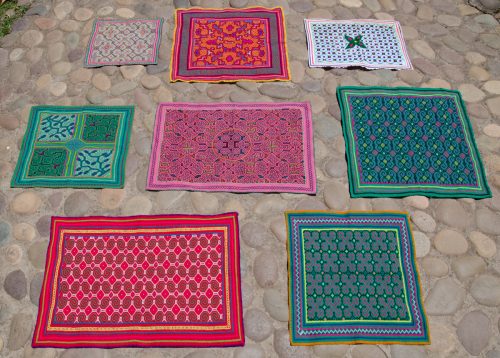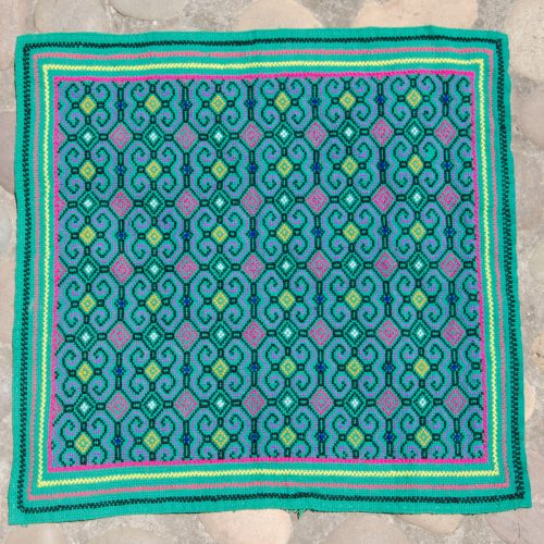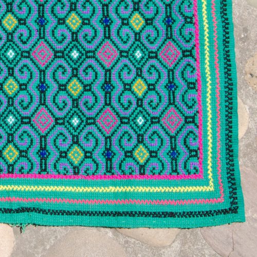 Beautiful square Shipibo Embroidery with geometric patterns in magenta, purple, black, pale orange, yellow and white on green cotton.