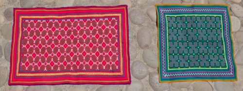 Rectangular Shipibo Embroidery with geometric designs in magenta, white, greens and blue on red cotton. Simple and strong!