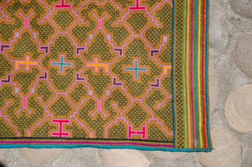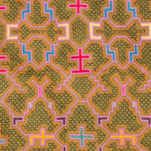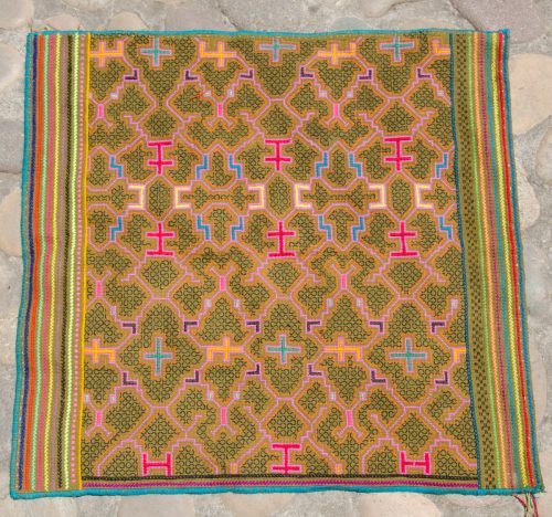 Super Stunning Square Shipibo Embroidery of the Map to Return to the Stars in pinks, magenta, turquoise, dark brown, greens and yellow on light brown cotton. Would make a gorgeous pillow cover or altar cloth!