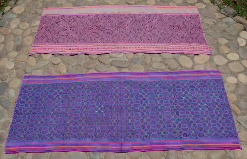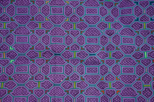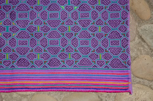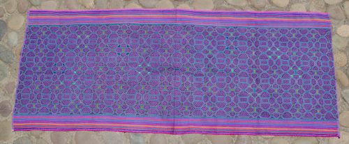 Large, rectangular Shipibo embroidery in geometric designs. In black, green, turquoise, pale orange, magenta, red and purple on purple cotton. Very beautiful!