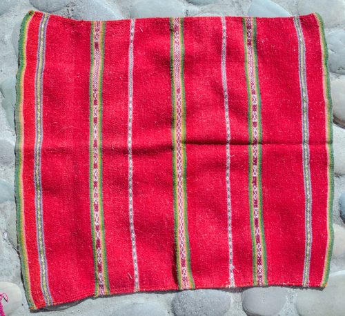 Square shaped handwoven textile in red with thin stripes of green and pink. Could be easily made into a large pillow or used as a cloth for the Cards of AN.