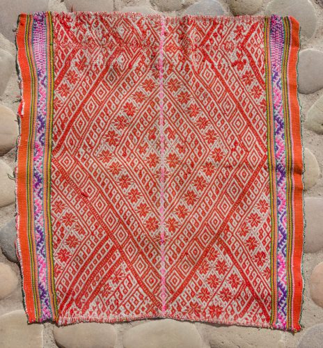 Small, antique weaving full of diamonds within diamonds and stars within diamonds. Has small woven bands on the sides of pink and purple. Since this is an antique weaving, they are some light stains and a bit of fraying on one of the edges. This just makes the energy more authentic. Could be used as a cloth for reading the Cards of AN.