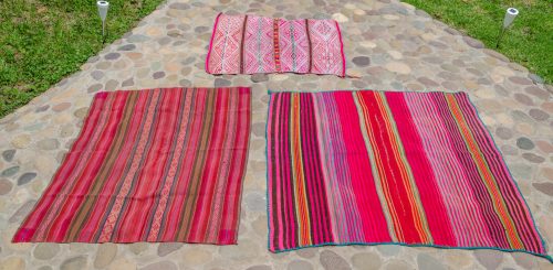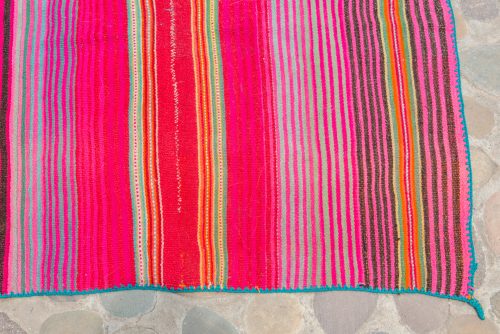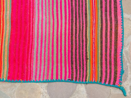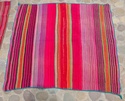 Very bright and radiant handwoven wool lliclia in various magentas with some greens, orange, pale yellow and black. The entire lliclia is edged in green. This is super beautiful and definitely anchors the energies of AN!