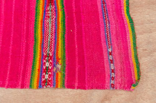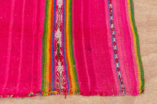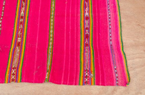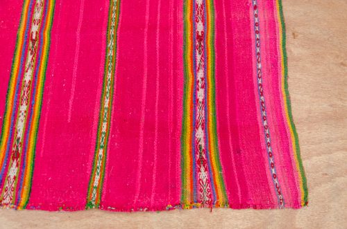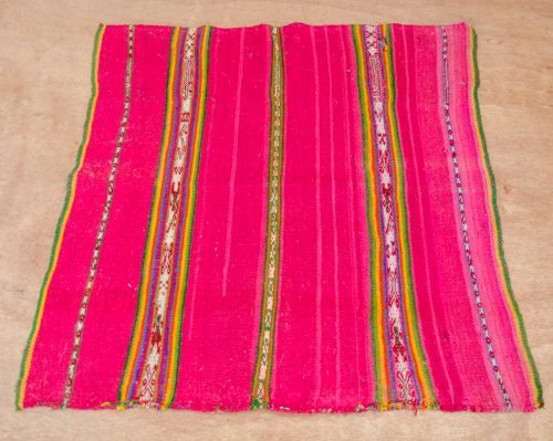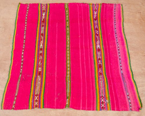 This is a very lovely small magenta weaving with striped bands of green, yellow, oranges and red. Unfortunately, it has some moth holes, so it is greatly reduced.