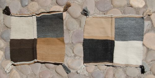 In four sections of natural alpaca fiber in natural, brown, black and dark grey to represent the Four Directions.