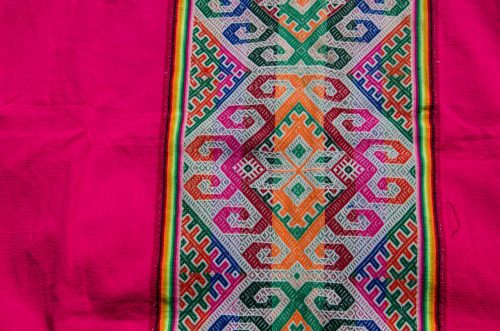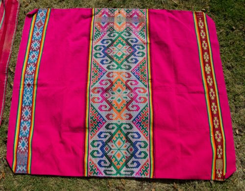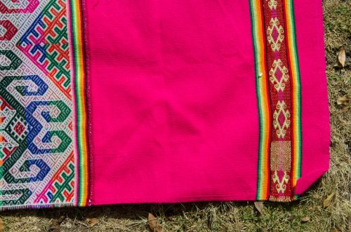 Large lliclia in a vibrant magenta with woven bands of geometric designs in various colors. Full of fresh energy!