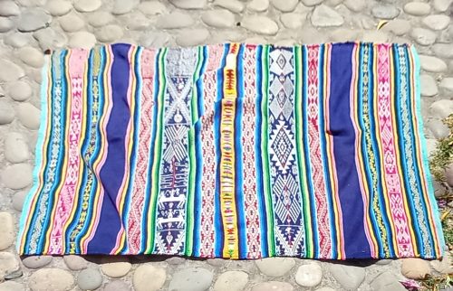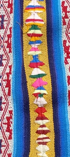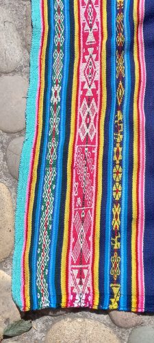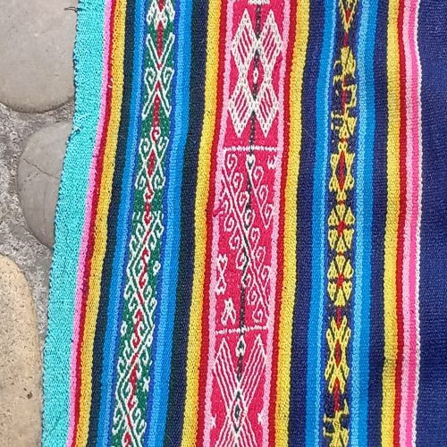 Gorgeous antique lliclia with bands of intricate geometric designs in multi-colors.