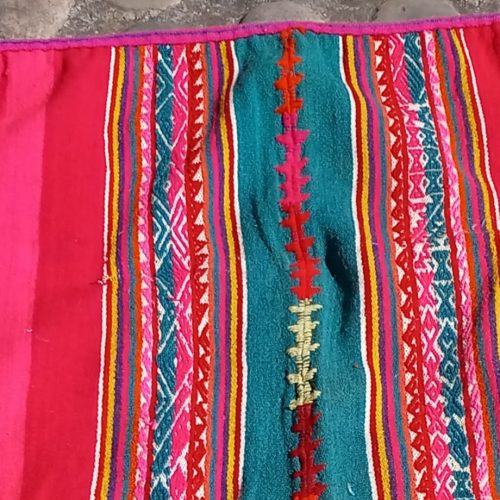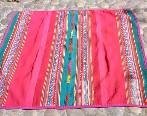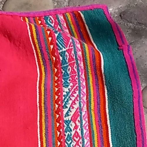 Vibrant, antique lliclia in magenta and green with magenta edging. Since it is an older weaving, it has a few small holes and stains which don’t mar its beauty, but give it character. The colors are more vibrant and more magenta, than in the photos.