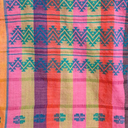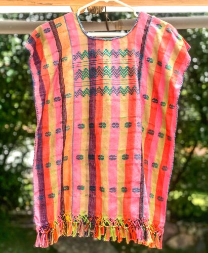 Handwoven cotton short huipil in stripes of pink, orange, yellow green and purple. Has geometric woven designs in green. Cool and fresh!