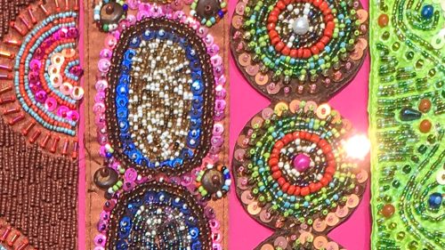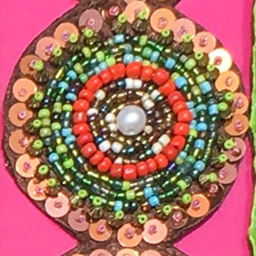 This beaded belt from Bali is brown with circular designs. The background is copper colored sequins on brown silk. The circles are filled with multi-colored green, orange & brown beads.
