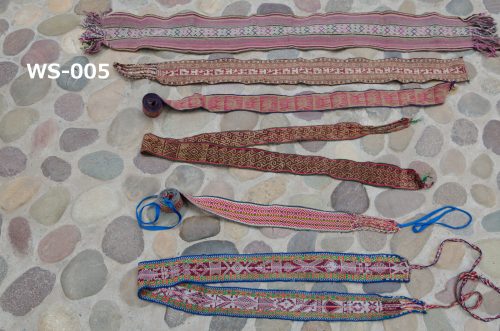 Wide, handwoven sash with various geometric Inka designs including llamas. In various natural shades including browns, grey, black, white and red.