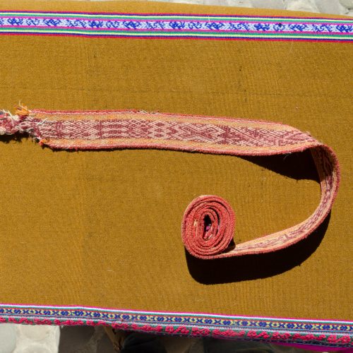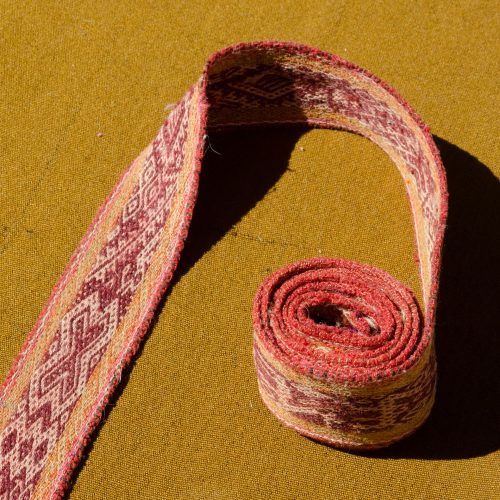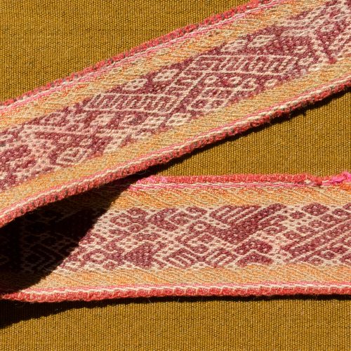 This is an antique, finely woven sash with a variety of geometric Inka designs. The colors are in oranges, dark red, red and a hint of magenta which bring a welcome warmth and richness. Since it’s not a new belt, there are a few visible repairs, which actually add to the charm and authenticity of this simple, but strong weaving.