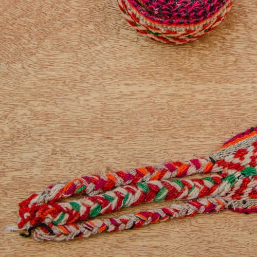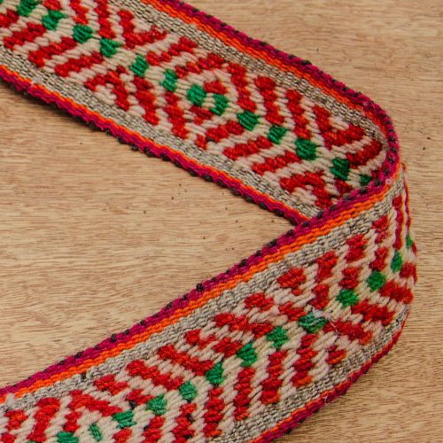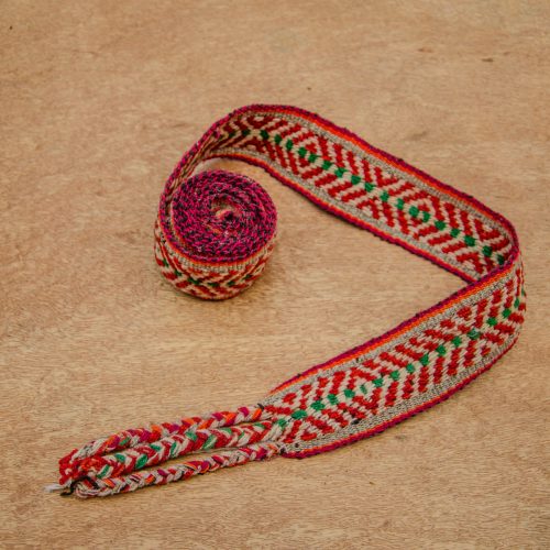 Long, handwoven belt in red, green and naturals with a simple geometric design.