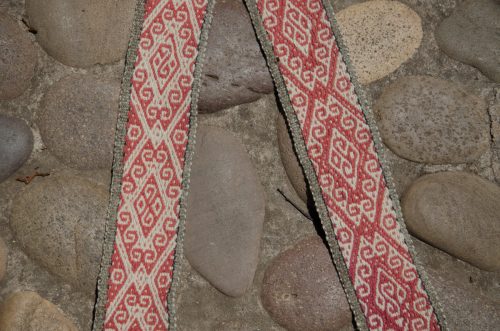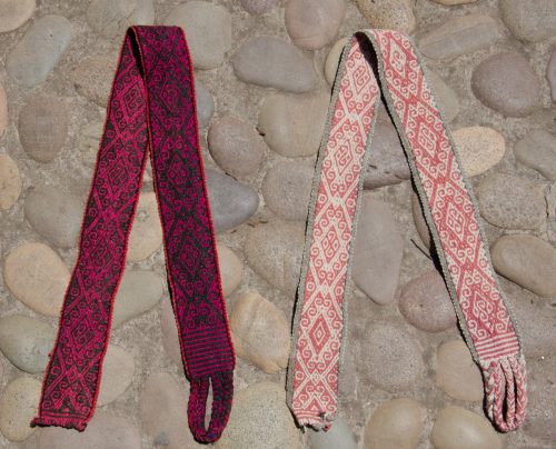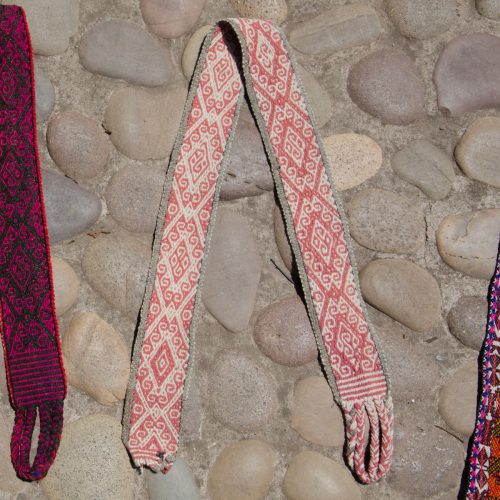Handwoven Belt in rose and natural with geometric designs. Color is reversed on other side.