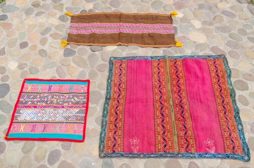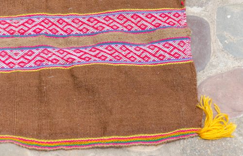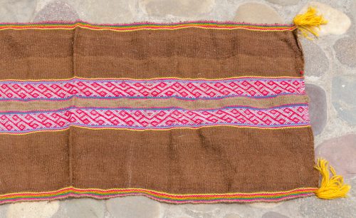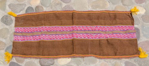 Small woven table runner by Juana, who used to live at the Heart of AN. It’s brown with woven bands of red and natural in geometric designs. Also has thin stripes of magenta, yellow, purple and green.